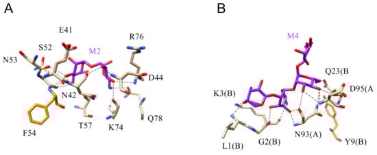 (A). Network of hydrogen bonds (black dashed lines) anchoring mannobiose (M2) to the amino acid residues forming the CBS of cyanovirin CVN (PDB code 2PYS). Aromatic residue F54 participating in a very weak stacking interaction with the pyranose ring of Man is colored orange. (B). Network of hydrogen bonds (black dashed lines) anchoring mannotetraose (M4) to cyanovirin (PDB code 3GXZ). Amino acid residues of A and B protomers forming the swapped CVN dimer, participate in the interaction with the oligomannoside.
