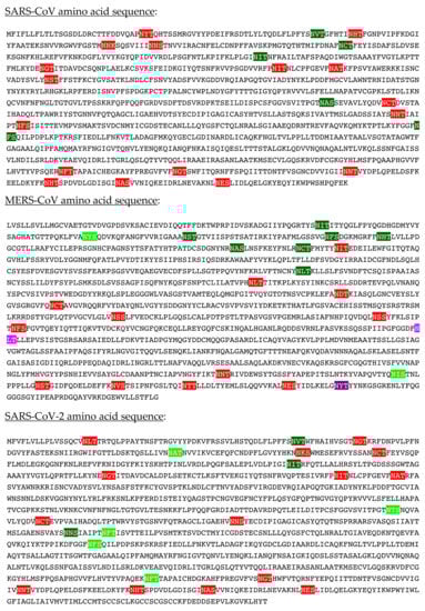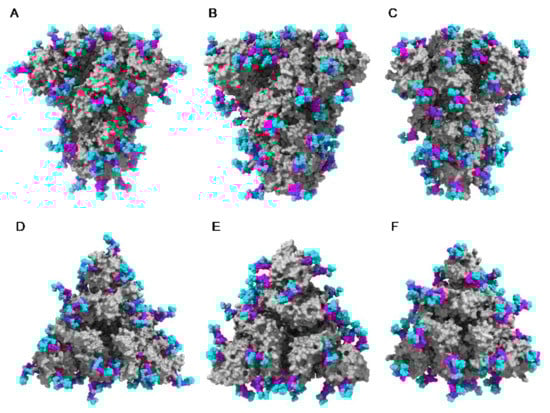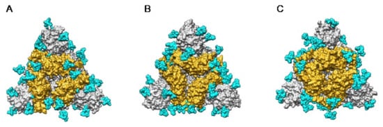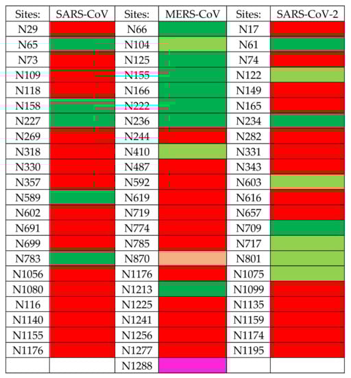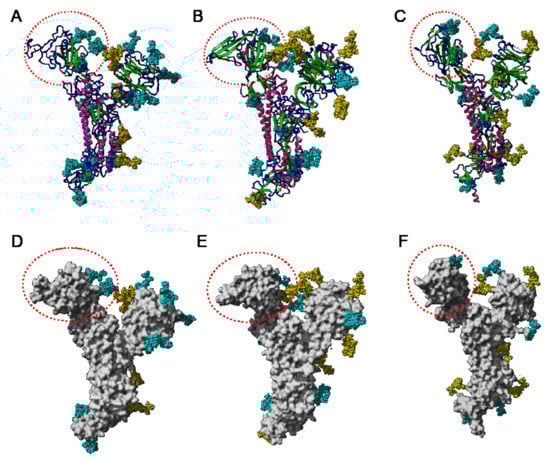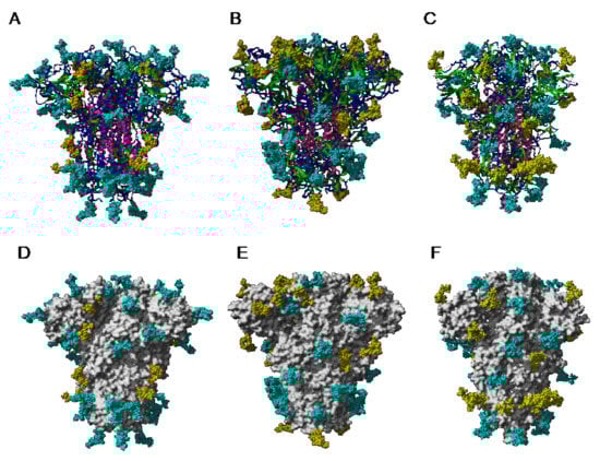 The extensive glycosylation at the surface of the S protein offers a shielding effect to SARS-CoV, MERS-CoV, and SARS-CoV-2. In addition to this protective role, a possible stabilization function has been postulated for some of the N-glycans covering the SARS-CoV-2 S protein, that could be exploited in the future for targeting the glycan coat by therapeutic drugs []. However, the distribution of the glycan shield at the surface of the spikes and especially, at the top of the spikes, does not consistently support a protective function susceptible to reduce the vulnerability of the coronaviruses towards antibody epitopes and/or exogenous proteases. In this respect, the exposed area of the RBDs at the top of the spikes is substantially free of glycans and thus, remains available for specific recognition by the opened spike conformation of the corresponding ACE2 (SARS-CoV and SARS-CoV-2) and DPP4 (MERS-CoV) host cell receptors (Figure 36A–C).