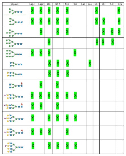 Glycan array analyses were performed by the Consortium for Functional Glycomics (http://www.functionalglycomics.org, accessed on 14 March 2021) for Con A, a typical member of the Man-specific single-chain lectins from the Fabaceae. Con A yielded the best interaction with the following glycans arranged in decreasing order of affinity (Figure 7):