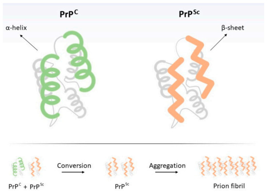 It is perplexing to observe that, opposed to other conventional pathogens (viroids, viruses, bacteria, fungi, and parasites) which are extrinsic to the host, the misfolded prion protein has an endogenous origin. The natively folded version of the prion protein, named cellular prion (PrPC), is a cell-surface glycoprotein encoded by the endogenous mammalian gene Prnp, which is present in all vertebrates [4] and highly expressed in the brain, and at lower levels in most other tissues. Its precise organismal/cellular function is not clear, although many roles have been proposed, including stem cell renewal [5], memory formation, and myelin homeostasis [6]. It is soluble, protease-sensitive and its tertiary structure is rich in alpha-helices (Figure 1). However, missense mutations on the Prnp gene typically result in an insoluble, protease-resistant, and beta-sheet-rich folding version (the pathological, misfolded ‘scrapie’ version—PrPSc) [7]. This, in turn, is non-functional and tends to form intra- and extracellular aggregates, which are possible causes of neuronal death. Therefore, TSE’s core element is, in fact, an incorrect version of a mammalian protein, and thus can be genetically inherited.