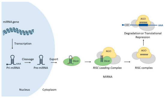MicroRNA biogenesis and mode of action. A nuclear-encoded miR gene is transcribed into a pri-miRNA, which is cleaved by Drosha enzyme resulting in a pre-miRNA. In turn, this molecule is exported to the cytoplasm via Exportin-5. Dicer enzyme processes pre-miRNA into miRNA duplex, and associates into RISC loading Complex (RLC). This step allows the transfer of the miRNA from Dicer to Argonaute (AGO). Finally, miRISC complex interacts with target mRNA, promoting its degradation or translational blockade. Image includes elements from the Servier Medical Art (http://smart.servier.com/ accessed on 17 June 2021), licensed under a Creative Commons Attribution 3.0 Unported License (https://creativecommons.org/licenses/by/3.0/) (accessed on 23 April 2021). Detailed miRNA canonical biogenesis encompasses several steps. Briefly, a miR gene is transcribed by RNA polymerase II into a long, polyadenylated, 5′ capped molecule denominated primary miRNA (pri-miRNA), which is processed by enzyme Drosha into a precursor miRNA (pre-miRNA). In turn, this molecule is exported to the cytoplasm via Exportin-5/RanGTP complex, where it is further processed by enzyme Dicer into a miRNA duplex (guide and passenger strands). Dicer and miRNA duplex associates with other proteins to form the RISC loading complex (RLC), which allows the transfer of miRNA from Dicer to Argonaute protein (AGO), thus forming miRNA-induced silencing complex—miRISC (Figure 2) (reviewed in [15]).