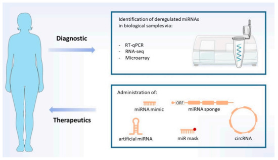 Diagnostic and therapeutics. Proposed diagnostic methods are based on analyses of prion disease-specific deregulated miRNAs (biomarkers). Potential therapies explore the use of several different miRNA-based strategies (indicated), which aim to restore the levels of down- and upregulated miRNAs. MiRNA mimics may be administered as single or double-stranded RNAs. Image includes elements from the Servier Medical Art (http://smart.servier.com/) (accessed on 17 June 2021), licensed under a Creative Commons Attribution 3.0 Unported License (https://creativecommons.org/licences/by/3.0/) (accessed on 23 April 2021).
