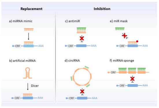 MiRNA replacement and inhibition therapies. Different strategies are used to restore miRNAs’ levels. Replacement approaches include: (a) chemically synthesized, mimic miRNA (orange), which targets the complementary mRNA (blue); (b) artificial miRNA (orange) which, after cellular processing, acts by binding to the target mRNA (blue) and degrading or repressing its translation. Inhibitors encompass: (c) antimiR (orange), which binds to the target miRNA (green) and makes it impossible to interact with the target mRNA (blue); (d) circRNA (orange), which sequesters the miRNA (green) from their target mRNAs (blue); (e) miR mask (orange), which blocks the action of the miRNA (green) by covering the binding site of its target mRNA (blue) without repressing it; (f) miRNA sponge (orange), which decreases the action of miRNAs (green) on their respective target mRNAs (blue), serving as a “trap” for miRNAs.
