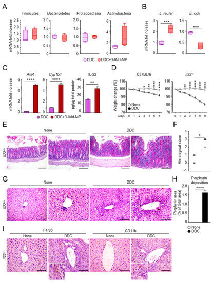 3.4. 3-IAld Prevents DDC-Liver Injury through the Microbiota-AhR-IL-22 Axis