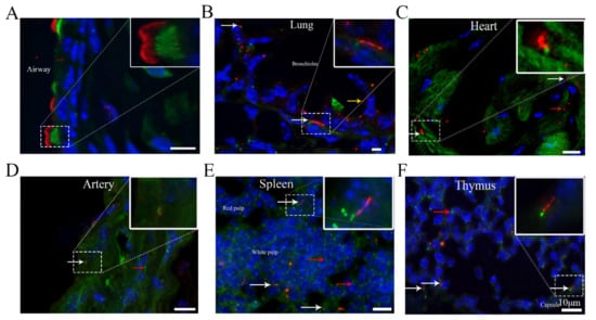Cilia are present in different tissues of the respiratory system, circulatory system and immune system. (A) Trachea, (B) bronchioles, (C) heart, (D) artery, (E) spleen, (F) thymus. White arrow, cilium with an ARL13B-mCherry+ axoneme and Centrin2-GFP+ basal body. Yellow arrow, cell with only ARL13B-mCherry. Red arrow, cell with only Centrin2-GFP. Green, Centrin2-GFP. Red, ARL13B-mCherry. Blue, DAPI. Scale bar, 10 μm.