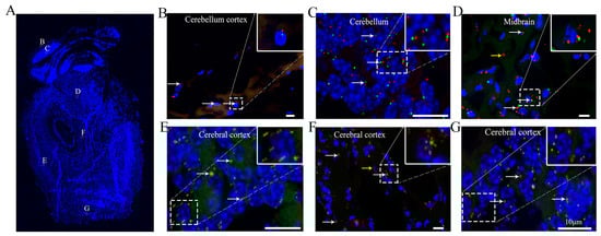 The cilia in the cerebral cortex are well, pointing to the center of the brain. (A) Sagittal sections of the brain, (B) cerebellar cortex, (C) cerebellum, (D) midbrain, and (E–G) cerebral cortex. Many ARL13B+ particles are visible in (F). White arrow, cilium with axoneme and basal body. Yellow arrow, localization of ARL13B. Red arrow, cells with only Centrin2. Green, Centrin2-GFP. Red, ARL13B-mCherry. Blue, DAPI. Scale bar, 10 μm.