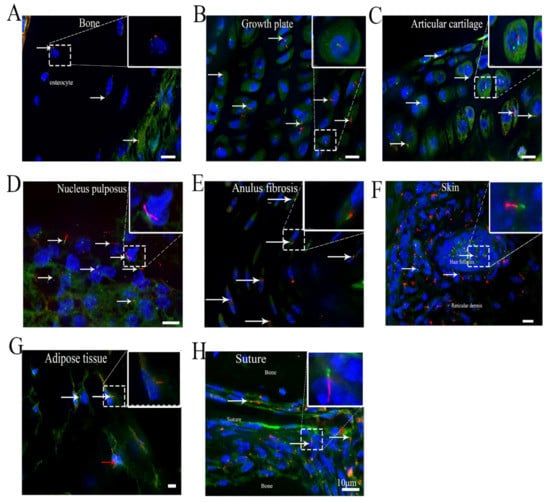 Cilia are present in different organs in the musculoskeletal system. (A) Bone tissue from femur, (B) growth plate from tibia, (C) articular cartilage, (D) NP in intervertebral disc, (E) AF in intervertebral disc, (F) skin, (G) adipose tissue, and (H) suture. White arrow, cilium with an axoneme and basal body. Yellow arrow, localization of ARL13B. Red arrow, cell with only Centrin2. Green, Centrin2-GFP. Red, ARL13B-mCherry. Blue, DAPI. Scale bar, 10 μm.