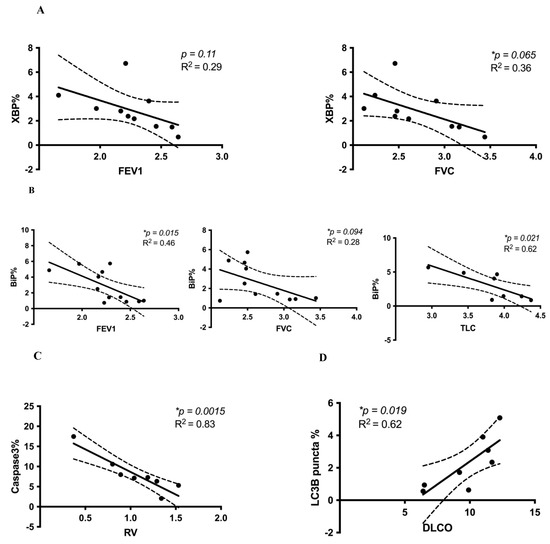 Correlations between cell stress markers and lung function in IPF. (A) The UPR marker XBP1% was negatively correlated with FEV1 and FVC. There was a trend of negative correlation between XBP1% and FEV1 (p = 0.11, R2 = 0.29) and a statistically significant negative correlation between XBP1% and FVC (p = 0.065, R2 = 0.36). (B) The UPR marker BiP% was negatively correlated with FEV1 (p = 0.015, R2 = 0.46), FVC (p = 0.094, R2 = 0.28), and TLC (* p = 0.021, R2 = 0.62). (C) The apoptosis marker cleaved caspase-3% was also negatively correlated with RV (p = 0.0015, R2 = 0.83). (D) The autophagy marker LC3β puncta% was positively correlated with DLCO (p = 0.019, R2 = 0.62). Confidence intervals are included, shown by the dotted curved lines flanking the regression line. Linear regression analyses were performed using GraphPad Prism 9. Lung volumes (FEV1, FVC, RV, TLC) were measured in liters, and the diffusion capacity of carbon monoxide (DLCO) was measured in mL/mmHg/min. * reprents the significant difference.