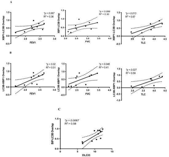 Correlations between co-localized UPR (XBP1, BiP) and autophagy (LC3β puncta) markers and lung function in IPF. (A) Co-localized XBP1 and LC3β puncta were positively correlated with FEV1 (* p = 0.067, R2 = 0.36), FVC (* p = 0.099, R2 = 0.30), and TLC (* p = 0.013, R2 = 0.67). (B) Co-localized LC3β puncta and XBP1 were positively correlated with FEV1 (* p = 0.02, R2 = 0.51), FVC (* p = 0.046, R2 = 0.41), and TLC (*p = 0.027, R2 = 0.59). (C) Co-localized BiP and LC3β puncta were positively correlated with DLCO (* p = 0.0067, R2 = 0.58). Confidence intervals are included, shown by the dotted curved lines flanking the regression line. Linear regression analyses were performed using GraphPad Prism 9. Lung volumes (FEV1, FVC, TLC) were measured in liters, and the diffusion capacity of carbon monoxide (DLCO) was measured in mL/mmHg/min.