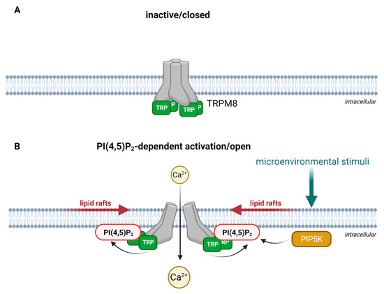 Schematic illustration of PI(4,5)P2-dependent activation as exemplified for TRPM8. (A) In the absence of PI(4,5)P2, the TRP-box holds the channel in a closed conformation. For simplification, other structural domains of TRPM8 are not illustrated. (B) Microenvironmental stimuli activate PI(4,5)P2 production via phosphorylation of phosphatidylinositol 4-phosphate by PIP5K (phosphatidylinositol-4-phosphate 5-kinase) in lipid rafts. The interaction of phosphatidylinositol 4,5-bisphosphate (PI(4,5)P2) the with the TRP-box activates TRPM8 and opens the channel for Ca2+ entry. Created with BioRender.com.
