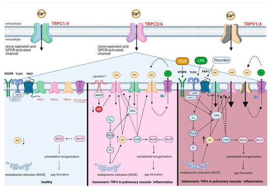 In this review, we present an update on the molecular mechanisms of TRP channel heteromerization for well-characterized (TRPC1/4, TRPC3/6) as well as newly emerging (TRPV1/4) TRP heteromeric assemblies in the pulmonary endothelium. All three heteromeric assemblies are expressed in the lung and of relevance in lung inflammation. Pulmonary endothelial cells can initiate and amplify inflammatory processes in various diseases or syndromes such as ARDS (acute respiratory distress syndrome) or COVID-19 (coronavirus disease 2019) [14,23,24]. In this context, Ca2+ as a second messenger plays a key role in activating inflammatory signaling pathways and is regulated, amongst others, by heteromeric TRP assemblies. Here, we will provide a comprehensive overview on the role of these assemblies in acute pulmonary vascular inflammation and discuss relevant methodological approaches and limitations for their analysis.