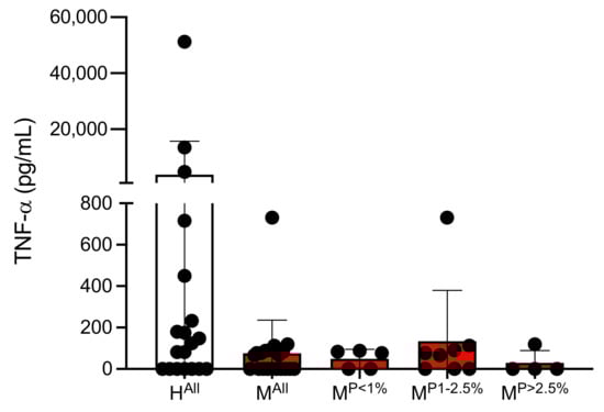 The amount of TNF-α in the plasmas of malaria patients and healthy controls was determined separately by ELISA. On average, significantly less TNF-α is present in the plasmas of malaria patients compared to controls (HAll: 3770 ± 11,925 pg/mL, MAll: 75 ± 160 pg/mL; however, this was not significant (p = 0.0531) (Figure 2, Supplementary Table S4).
