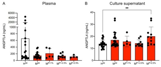Amount of ANGPTL4 in plasma (A) and culture supernatants (B) of endothelial cells (HBEC-5i) co-incubated with plasma from malaria patients and healthy individuals. Statistical analyses were performed using the Mann–Whitney U test (** p < 0.01) (Supplementary Table S6). Abbreviations: Healthy controls (HAll); malaria patients (MAll); malaria patients with a parasitaemia < 1% (MP<1%), 1–2.5% (MP1−2.5%) and >2.5% (MP>2.5%).