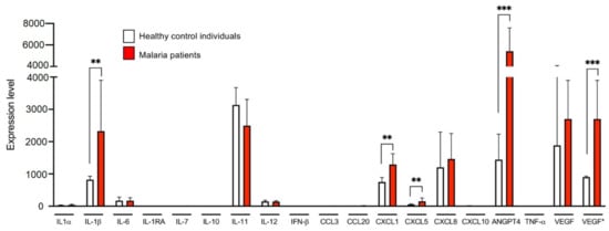 - Lyke, K.E.; Burges, R.; Cissoko, Y.; Sangare, L.; Dao, M.; Diarra, I.; Kone, A.; Harley, R.; Plowe, C.V.; Doumbo, O.K.; et al. Serum levels of the proinflammatory cytokines interleukin-1 beta (IL-1beta), IL-6, IL-8, IL-10, tumor necrosis factor alpha, and IL-12(p70) in Malian children with severe Plasmodium falciparum malaria and matched uncomplicated malaria or healthy controls. Infect. Immun. 2004, 72, 5630–5637. [Google Scholar] [CrossRef]
