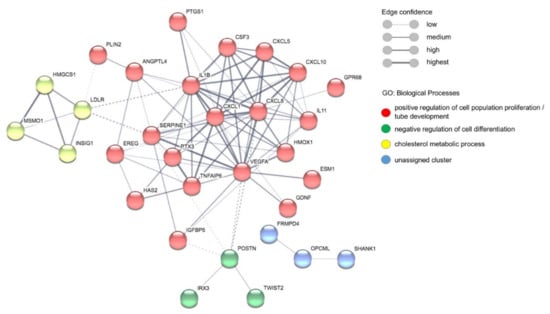To identify the biological processes in which the proteins encoded by the identified genes but also the cytokines identified by LEGENDplex and ELISA are involved, a gene set enrichment analyses (GSEA) was performed using g:Profiler analysis [] (Table 1). The g:Profiler analyses shows that within the gene ontology term biological processes (GO:BP), ‘positive regulation of cell migration’, ‘blood vessel development’ and ‘inflammatory response’ are significantly regulated (padj = 7.602 × 10−5, 2.542 × 10−4 and 2.474 × 10−4, respectively). The KEGG pathways ‘rheumatoid arthritis (padj = 4.499 × 10−4) and ‘IL-17 signaling pathway’ (padj = 3.436 × 10−4) also were found to be upregulated (Table 1). To identify protein–protein interaction networks, a Markov Clustering (MCL) analyses was performed using the program STRING, version 11.0 [,]. This analysis yields four clusters, the largest comprising 20 proteins, which are involved in ‘positive regulation of cell population proliferation’ (padj 4.312 × 10−8) and ‘tube development’ (padj 1.948 × 10−5). The cluster ‘cholesterol metabolic process’ (padj 3.1 × 10−6) contains four proteins and the cluster ‘negative regulation of cell differentiation’ (padj 3.4 × 10−2) contains three proteins. In addition, an unassigned cluster (three proteins) was predicted (Figure 6, Table 1).