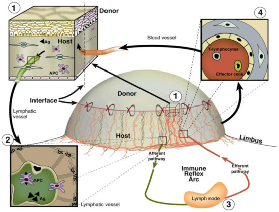 Figure 1. Importance of blood and lymphatic vessels in the host bed of high-risk corneas as exit and entry routes of the immune reflex arc for subsequent immunologic graft rejection. (1) Magnification of the host–graft interface: blood (red) and lymphatic vessels (green) reach the host–graft interface. Antigen (Ag) and antigen presenting cells (APCs) both of host and donor can leave the cornea using corneal lymphatics (2), conjunctival lymphatics and then as the afferent arc of the immune response reach the regional lymph nodes (3). After stimulation of alloreactive T lymphocytes, these and other effector cells/antibodies can reach the graft via corneal blood vessels ((4): efferent arc of the immune response). Reproduced from Cursiefen et al. 2003 [48].
