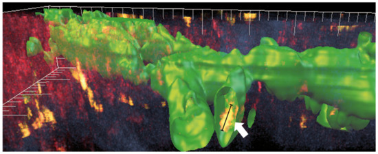 Figure 2. Intravital visualization of lymphatic vessels in the vascularized cornea. By 3D-reconstruction of a 2-photon image stack through the vascularized cornea immune cells (arrow) shown in yellow as an overlay of Alexa488 fluorophore (green) and autofluorescence signal in Alexa488 labeled lymphatic vessels (green), could be observed (Adapted from Steven et al. 2011 [69]).