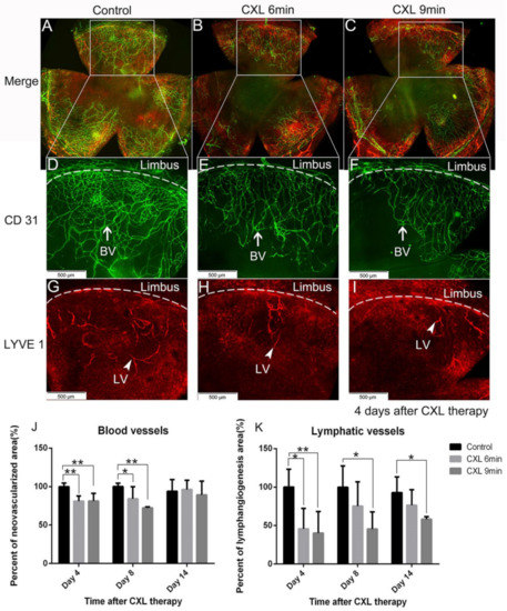 Figure 4. Regression of mature corneal blood (BV) and even more so lymphatic vessels (LV) after UV-A-light based corneal collagen crosslinking (CXL). Corneal whole mount staining after induction of inflammatory corneal neovascularization was performed to quantify both corneal blood and lymphatic vessels via immunohistochemistry. Corneal vessels were double stained 4 days after CXL treatment ((AC): merged images). Blood vessels were stained with FITC-conjugated CD31 ((DF): BV with white arrow in green) and lymphatic vessels were stained with lymphatic vessel endothelial hyaluronan receptor 1 (LYVE-1) followed by Cy3-conjugated secondary antibody ((GI): LV with white arrowhead in red) (magnification: ×100; scale bar: 500 μm). Corneal lymphatic vessels in the 6-min CXL-treated group showed a significant reduction on day 4 post CXL but not on day 8, while in the 9-min CXL-treated group, lymphatic vessels were regressed significantly on both day 4 and day 8 after treatment (K) (n = 5; * p < 0.05, ** p < 0.01). At 14 days after CXL treatment, corneal lymphatic vessels in the 9-min CXL-treated group were still significantly reduced compared with the control group, while there was no significant difference in the 6-min CXL-treated group (K). Mature corneal blood vessels were regressed significantly on day 4 and day 8 after a 6-min or 9-min CXL treatment (J). (n = 5; * p < 0.05). Reproduced from Hou et al. 2018 [24].
