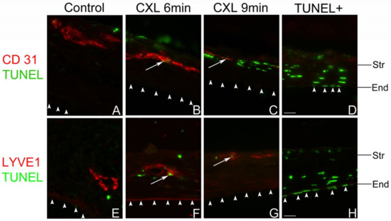 Figure 5. Apoptosis of vascular endothelial cells in corneas after UV-A-light based CXL. Representative terminal deoxynucleotidyl transferase dUTP nick end labeling (TUNEL) assay images of the central corneas from murine corneas 1 day after UV-A-light based CXL for 6-min (B,F) or 9-min (C,G) and non-crosslinked control corneas (A,E). White arrows indicate TUNEL (green) and CD31+ (AD) or lymphatic vessel endothelial hyaluronan receptor 1 (LYVE1) + (EH) (red) vascular endothelial cells in each panel. Corneal nonvascular endothelial cells are TUNEL negative in all groups; (D,H) positive control of TUNEL staining (Str: stroma; End: nonvascular endothelium. Colocalization: white arrow. Corneal nonvascular endothelium: white arrowhead. Magnification: ×600. Scale bar: 20 μm). Corneal epithelium is missing in the treatment groups due to corneal abrasion. From Hou et al. 2018 [24].