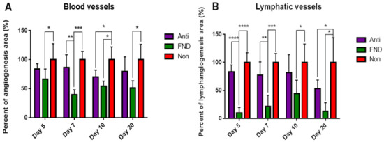 Figure 7. Effect of fine needle diathermy (FND) on regression of blood vessels (A) and lymphatic vessels (B) at four time points after treatment (after 14 days of corneal suture placement to induce inflammatory corneal neovascularization). Compared to the non-treated group (NON: red column), the FND treated group (green column) resulted in significant regression of both blood and lymphatic vessels at all four time points (p < 0.05; Anti: anti-inflammatory treatment only, purple column). The most obvious effect of FND is observable at day 7 with the reduction of hemangiogenesis by 60% (p < 0.0001) and lymphangiogenesis by approximately 80% (p < 0.0001) as compared to the NON group. (* p < 0.05; ** p < 0.01; *** p < 0.001; **** p < 0.0001). From Le et al. 2018 [25].
