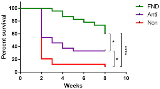 Importantly, we have recently demonstrated that preoperative FND treatment of pathologically pre-vascularized high-risk recipients can significantly enhance allograft survival after subsequent corneal transplantation in mice [25] (Figure 8). Further studies may be helpful to show whether additional postoperative therapy can further enhance graft survival. Beyond that, as FND is already clinically used in patients to treat corneal neovascularization, translational clinical studies analyzing its effect on graft survival should be feasible. In fact, a clinical pilot study by our group has demonstrated promising initial results (see Section 6.2) [47].