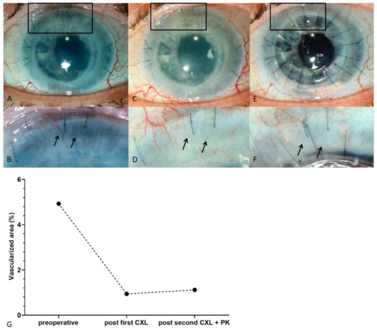 Figure 9. Angioregressive effect of isolated peripheral UVA-light based CXL in a high-risk cornea after 7 failed previous grafts. (A) vascularized cornea with marked corneal edema after failure of previous graft. (B) Magnification of insert in (A); arrows depict a stromal corneal vessel. (C) Three weeks after peripheral CXL excluding the limbal vascular arcade; significant regression of corneal neovascularization is observed. (D) Magnification of insert in (C); note that the blood vessel from (B) has disappeared (arrows). (E) Two weeks after second peripheral CXL combined with re-keratoplasty. Corneal blood vessels are still absent without revascularization, and the transplant is clear. (F) Magnification of insert in (E); the blood vessel is still absent (arrows). (G) Morphometric quantification of corneal blood vessels shows marked reduction of corneal neovascularization. From Schaub et al. 2018 [91].