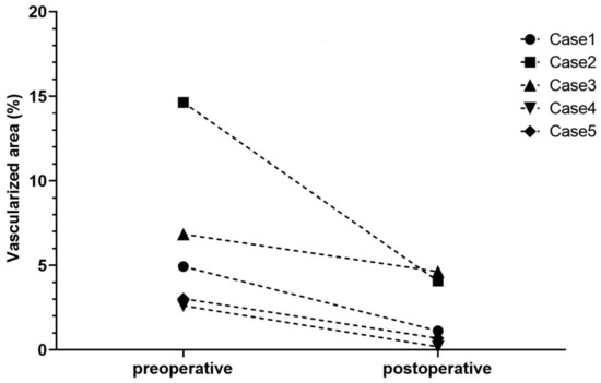 Figure 10. Reduction of corneal neovascularization by peripheral CXL before high-risk PK. In case 1, 1 peripheral CXL was first performed as a single procedure, followed by an additional peripheral CXL procedure combined with keratoplasty. In cases 2 to 5, the peripheral CXL procedure was directly combined with keratoplasty (without previous peripheral CXL). Corneal neovascularization was morphometrically measured as the corneal area covered by blood vessels in relation to the total corneal area. Morphometrical analysis revealed a neovascularization reduction of 70.5 ± 22.7%. From Schaub et al. 2018 [91].