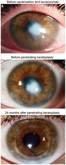Figure 11. Clinical follow-up of a patient with corneal neovascularization treated with fine-needle diathermy (FND) and bevacizumab application before penetrating keratoplasty. In this eye, no graft rejection was observed. (A) Herpetic corneal scar with corneal neovascularization in the lower corneal quadrants before FND and bevacizumab application. (B) Corneal scar without neovascularization 6 months after FND and bevacizumab application (1 day before penetrating keratoplasty). (C) Clear cornea without any signs of allograft rejection 24 months after penetrating keratoplasty. From Hos et al. 2019 [47].