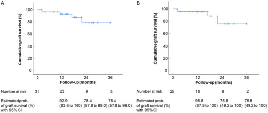 Figure 12. Impact of pre-transplant fine-needle diathermy (FND) combined with subconjunctival bevacizumab injection on corneal allograft survival after subsequent high-risk penetrating keratoplasty. Kaplan–Meier curves depicting the estimated probabilities of rejection-free corneal graft survival after penetrating keratoplasty. Estimated probabilities of rejection-free corneal graft survival were 92.9% after 1 year (number at risk: 23), 78.4% after 2 years (number at risk: 9), and 78.4% after 3 years (number at risk: 3) for all study eyes (non-HLA-matched and HLA-matched keratoplasties) (A) and 95.8% after 1 year (number at risk: 18), 75.8% after 2 years (number at risk: 6), and 75.8 after 3 years (number at risk: 2) for eyes only with non-HLA-7 matched keratoplasties (B). Mean follow-up time: 560 days; range: 59–1095 days. Vertical dashes indicate censored observations. CI, confidence interval. From Hos et al. 2019 [47].