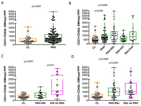 Our results confirm the increase of circulating EMVs in PAH, Additionally, we aimed to analyse whether the number of EMVs differ among different PAH subtypes. We also included patients with diseases at risk of developing PAH, namely scleroderma and HIV infection, to evaluate to what extent differences in circulating EMVs could be related to the underlying diseases. Our results show that the levels of EMVs vary between the different PAH subtypes, being significantly increased, compared to healthy controls, in iPAH and PAH-SSc. Matched PAH and controls subanalyses suggest that the observed results found are independent of gender or age.