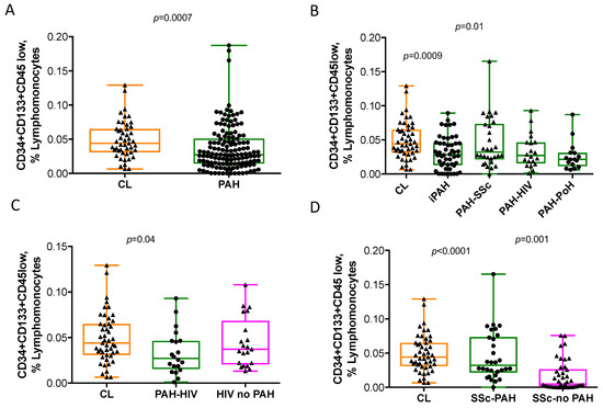 Percentage of circulating progenitor cells (PCs) in pulmonary arterial hypertension, scleroderma and HIV infection and healthy controls. Percentage of (A) CD34+CD133+CD45low labelled cells, expressed as percent of lymphomonocytes, in pulmonary arterial hypertension (PAH) versus healthy controls; (B) percentage of CD34+CD133+CD45low labelled cells in all the different PAH subtypes versus healthy controls; (C) Percentage of CD34+CD133+CD45low labelled cells in patients with HIV infection, with or without associated PAH; (D) percentage of CD34+CD133+CD45low labelled cells in patients with scleroderma, with or without associated PAH. The whiskers extend from the minimum to maximum points. Mann Whitney Rank Sum test and Kruskal-Wallis One Way Analysis of Variance and when significant, post-hoc Dunn’s multiple comparisons test.