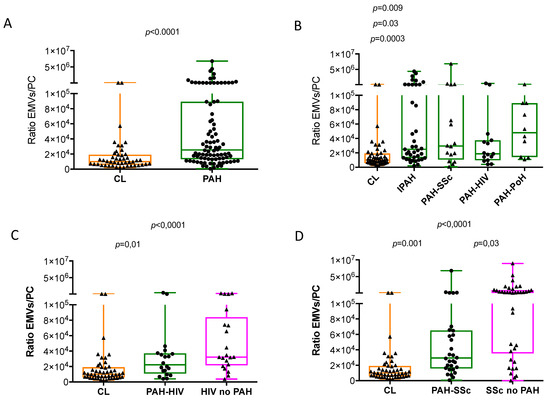 We assessed the ratio of EMVs to PCs, which reflects the balance between endothelial cell damage and repair capacity as a measure of vascular competence. The EMVs/PCs ratio was significantly increased in patients with PAH and in most PAH subtypes, compared with healthy individuals (Figure 3A,B). Patients with HIV, with or without PAH, had significantly higher ratios of EMV/PC than controls (Figure 3C). Likewise, SSc patients, with or without PAH, showed a significantly higher ratio than controls; the group of SSc patients without PAH showed the highest ratio (Figure 3D).