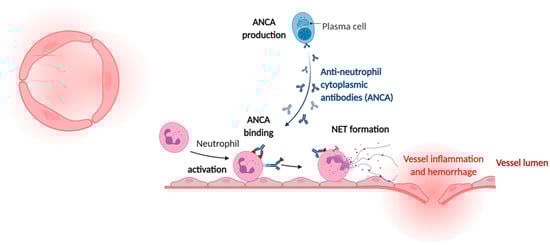 NETs in ANCA-associated vasculitis. (Left): Cross-section of a small vessel. (Right): Pathogenesis of ANCA-associated vasculitis is multifactorial, involving numerous immune cells. B lymphocytes feature prominently as producers of ANCAs, while activated neutrophils undergo NETs formation driving tissue damage via injury to the vascular endothelium (made with biorender.com, accessed on 4 June 2001).