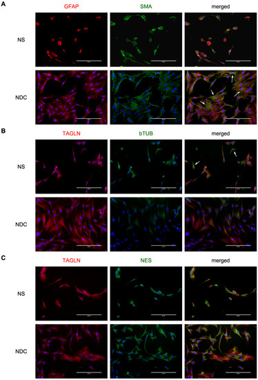 NDC and NS were both stained with vascular markers, SMA and TAGLN (Figure 1), but NDC cultures have a portion of cells with a much more prominent SMA signal (Figure 1A and Figure S1). The expression data support this observation: NDC have much higher ACTA2, SMA gene, (log2FC = 3.65, p = 4.46 × 10−22), and TAGLN expression (log2FC = 4.87, p = 9.5 × 10−43). It seems that while NDC still retain glial (GFAP) and neuronal (beta-tubulin and nestin) markers, they are shifted more towards other cell types.