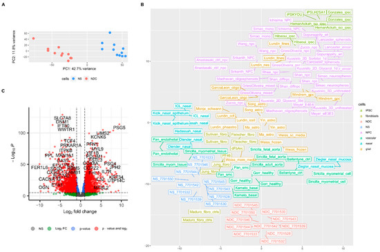 NDC and NS transcriptomes. (A) Principal component analysis of NDC and NS transcriptomes. (B) t-SNE plot (with perplexity parameter, p = 15) of NS, NDC, and other transcriptomes from: NPC and mixed stem neuronal cells, IPSC, fibroblasts, various cells from nasal biopsies, glial cells, vascular cells, and fibroblasts; the complete list is in Table S1 in the Supplementary File. (C) Volcano plot of NDC vs. NS results of differential expression analysis with Deseq2.