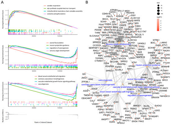 GSEA of GO: BP results of NDC vs. NS expression data. (A) Representative GSEA curves of significant (p < 0.05, Benjamini–Hochberg adjusted) biological processes: energy metabolism, neuronal, and vascular (top to bottom). Coloured stroke panels represent occurrences of individual genes, belonging to corresponding gene sets. Running enrichment scores are built on genes, ordered by ranking score [-log (Deseq2 p-level, adjusted) * sign (FC)]; the common scale is depicted at the bottom of the picture. The genes on the left are expressed more in NDC while those on the right in NS. (B) Network of downregulated in NDC individual genes, which belong to various neuronal and vascular GO:BP ontologies, enriched in GSEA (ontologies’ names are in blue). The colour corresponds to log2(FC); the size of the node is proportional to the size of the gene set.