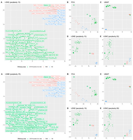 Transcriptomic typing with Kuusisto et al. datasets [42]. (A) The t-SNE plot (with perplexity parameter, p = 15) of transcriptomic data of NS and NDC with data from the Kuusisto et al. dataset. A subset of the data was used for this picture—all substances with the longest time of exposure (up to 39 days). For cadmium, there are three points (50 µM exposure for two, four, and six days) and the only available dataset for maneb is exposure with 60 µM of the substance for one day. (B–E) The same picture is visualised with PCA (B), UMAP (C), and t-SNE with p = 10 (D) and p = 20 (E). The point corresponding to maneb RNA-seq data is represented as an asterisk and the cadmium data as crossed circles.