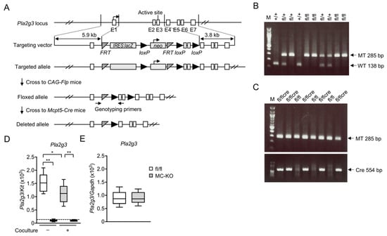 We successfully generated Pla2g3-floxed (Pla2g3fl/fl) mice, in which the exons encompassing the catalytic domain of the Pla2g3 gene were replaced with the IRES:lacZ and neo cassettes and flanked by FRT or loxP sites, for the purpose of conditional inactivation of the gene in a cell- and tissue-specific manner (Figure 1A). To examine the function of Pla2g3 in MCs, we crossed Pla2g3fl/fl mice with Mcpt5-Cre mice [39], which express Cre recombinase selectively in MCs. Mice with conditional deletion of Pla2g3 (Pla2g3fl/flMcpt5-Cre) were screened by genotyping PCR (Figure 1B,C).