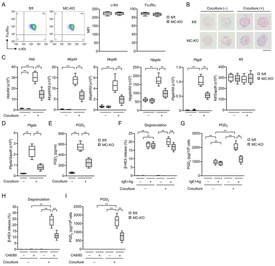 Before or after coculture with 3T3 fibroblasts, 106 BMMCs were preloaded for 2 h with 1 µg/mL anti-dinitrophenyl (DNP) IgE (clone SPE-7, Sigma-Aldrich, St. Louis, MO, USA) in Tyrode’s buffer. After removal of the excess antibody, the cells were stimulated with 100 ng/mL human serum albumin (HSA) conjugated with DNP (DNP-HSA; Sigma-Aldrich) as an Ag for 10 min at 37 °C. As required for experiments, the cells were directly activated by 10 μg/mL Compound 48/80 (C48/80; Sigma-Aldrich), an IgE-independent MC secretagogue. The degree of degranulation was determined by measuring the release of β-hexosaminidase (β-HEX), as described previously [43]. The levels of PGD2 were determined by ELISA in accordance with the manufacturer’s instructions (PGD2-MOX ELISA Kit, Cayman Chemical, Ann Arbor, MI, USA).