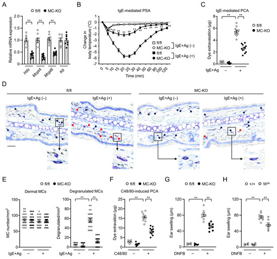 - Dudeck, A.; Dudeck, J.; Scholten, J.; Petzold, A.; Surianarayanan, S.; Kohler, A.; Peschke, K.; Vohringer, D.; Waskow, C.; Krieg, T.; et al. Mast cells are key promoters of contact allergy that mediate the adjuvant effects of haptens. Immunity 2011, 34, 973–984. [Google Scholar] [CrossRef] [PubMed] [Green Version]