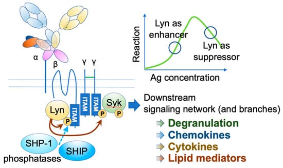 FcεRI activation. Upon FcεRI aggregation, Lyn initiates downstream signaling events through phosphorylation of ITAMs on FcεRI β and γ. Syk binds phosphorylated γ ITAM, and Lyn phosphorylates tyrosine residue of FcεRIγ-bound Syk. Activated Lyn and Syk further phosphorylate many downstream signaling molecules, leading to degranulation and de-novo synthesis of chemokines, cytokines, and lipid mediators. Under strong stimuli, Lyn recruits SHIP1 and SHP-1 via the phosphorylated FcεRI β ITAM and suppresses the reaction.