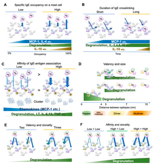 Differential mast cell activation by various antigens. (A) Effects of antigen-specific IgE occupancy on mast cell surface FcεRIs. (B) Effects of antigen-binding durations. (C) Effects of affinity between IgE and its cognate antigens. The antigen concentration is adjusted so that the phosphorylation levels of FcεRIβ and γ chains are similar. Abundant low-affinity antigens induce few and large clusters, while a small amount of high-affinity antigens induce many small clusters. (D) Effects of spacing between antigen epitopes. (E) Effects of antigen valency and/or IgE clonality. (F) Effects of affinity of different clones against the same antigen.