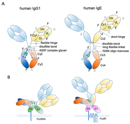 Schematic representation of human IgG1 and IgE. (A) The extended conformations. The three-dimensional coordination (front or back) is shown. F, front; B, back. (B) The receptor bound conformations. Please note that IgE Fab is almost in the upright position, suitable for sensing its target antigens.