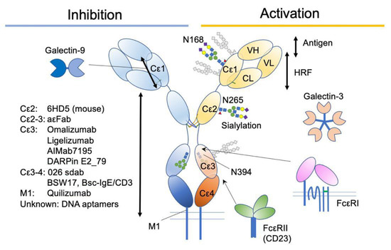 Immunoglobulin E (IgE) is a unique Ig isotype with the lowest serum concentration, which confers a sensory mechanism of adaptive immunity to the otherwise innate type of effector cells, including mast cells and basophils. Its relatively long half-life (~3 weeks) on the high-affinity IgE receptor FcεRI, together with the minute-order response time, enables protection from the invasive venoms [1] and fast-moving parasites [2] using the ambush strategy. In addition, bacterial invasion through acute injury is reported to be prevented by IgE and mast cells [3]. To fight against these threats, mast cells and basophils degranulate upon recognition of multivalent antigens by IgEs to rapidly release preformed substances, including histamine and proteases, and initiate the de novo production of lipid mediators, cytokines, and chemokines [4,5,6]. However, dysregulation of this potentially harmful reaction leads to allergic diseases, such as anaphylaxis. In addition to the well-established knowledge obtained from animal models, the central role of IgE in allergic diseases in humans has been endorsed by the emergence of anti-IgE therapy by omalizumab, effective against various allergic diseases, including asthma, chronic spontaneous urticaria, nasal polyps, and allergic rhinitis. To overcome allergic diseases, an understanding of the regulation of IgE functions is essential. In this review, we discuss the fine-tuning of IgE functions by various IgE-binding factors, including the emerging drug candidates. The readers interested in the biological or medical significance of IgE-dependent reactions are referred to other excellent reviews [7,8,9,10,11,12,13].