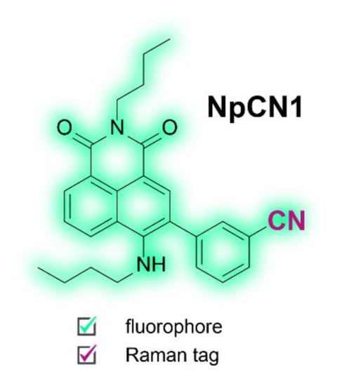 1,8-Naphthalimides are a class of fluorophores commonly used in imaging due to their biocompatibility, chemical stability, photostability, high quantum yields, and large Stokes shifts [34]. Whilst the core structure is easily modified for different applications, naphthalimides have seen little use in fluorescence multimodal imaging probes and are yet to be functionalised for vibrational spectroscopy. The nitrile functional group has been recognised as a suitable Raman tag, but the spectral signature is relatively weak [22]. By attaching it to the naphthalimide core as a benzonitrile, we sought to change the polarizability and increase the intensity of the peak in Raman spectroscopy to create a probe suitable for use in both modalities. For this purpose, we designed and synthesized NpCN1, a 4-amino-1,8-naphthalimide with a 3-benzonitrile substituted at the 3-position (Figure 1). We had also tested alkyne tagged naphthalimides [35,36] (Scheme S2, Figure S1), but the benzonitrile tagged naphthalimide had superior properties (Figure 2).