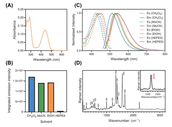 (A) Absorbance spectrum of NpCN1 (10 µM) in absolute ethanol. (B) Normalised fluorescence excitation and emission spectra and (C) integrated fluorescence emission intensity of NpCN1 (10 µM) in a variety of solvents; ex = excitation, em = emission, CH2Cl2 = dichloromethane, MeCN = acetonitrile, EtOH = ethanol. (D) Raman spectrum of NpCN1, in the solid state, taken with the 50X and 785 nm laser excitation; inset shows the 2232 cm−1 C≡N band tracked in this study.