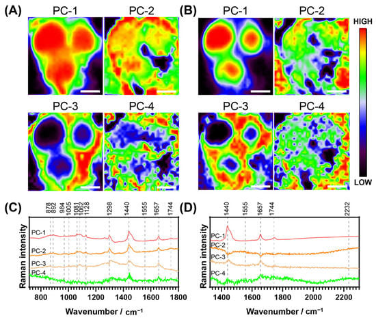 Principal component analysis of the Raman spectra of a cell dosed with NpCN1 (20 μM, 4 h); same representative cell as shown in Figure 4. (A,B) show the PC maps of each of the scores of the four main PC of the spectra collected from 715–1806 cm−1 and 1327–2304 cm−1, respectively. (C,D) show the loadings of the scores mapped in (A,B), respectively. The scale bar represents 10 μm for all maps.
