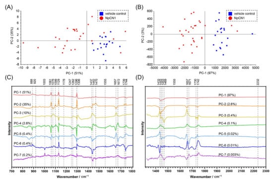 PCA of the average spectra of individual 3T3-L1 cells dosed with NpCN1 (20 μM, 4 h) or equivalent volume DMSO as a vehicle control. Scores plots of the spectra from (A) 715 to 1806 cm−1 and (B) 1327 to 2304 cm−1 show a separation of the populations of cells. (C,D) show the loadings of the scores plotted in (A,B), respectively, along with the contribution of each PC.