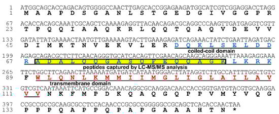 Previous studies have shown that, during transportation in their vectors, begomoviruses were enclosed in vesicles [,]. To identify the putative proteins that bind to the TYLCV CP in the MEAM1 whitefly, we conducted Co-IP (Supplementary Figure S2) coupled with LC-MS/MS assay, and the proteins were listed in Supplementary Table S1. Among the candidate proteins identified, vesicle-associated membrane protein 2 (BtVAMP2, NCBI accession number: XP_018904064.1) was subjected to further analysis as it is annotated to the vesicle-mediated transport pathway (GO:0016192) by gene ontology analysis. However, it is hard to identify the band of BtVAMP2 in the gel picture (Supplementary Figure S2) after Co-IP analysis via Coomassie blue staining. As the BtVAMP2 on the gel picture should be close to 16 kDa, it is difficult to visualize in this gel picture. BtVAMP2 contains a coiled coil domain (58–88 aa), a transmembrane region (90–112 aa), and the peptides of BtVAMP2 captured by Co-IP coupled with LC-MS/MS were located in the 68–84 aa region (Figure 1).