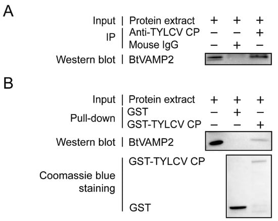 Next, we conducted Co-IP, GST pull-down assays to examine further the interaction between BtVAMP2 and TYLCV CP. Co-IP assay showed BtVAMP2 interacted with TYLCV CP in vivo (Figure 2A), and GST pull-down assay showed that BtVAMP2 could be pulled down by GST-TYLCV CP (Figure 2B).
